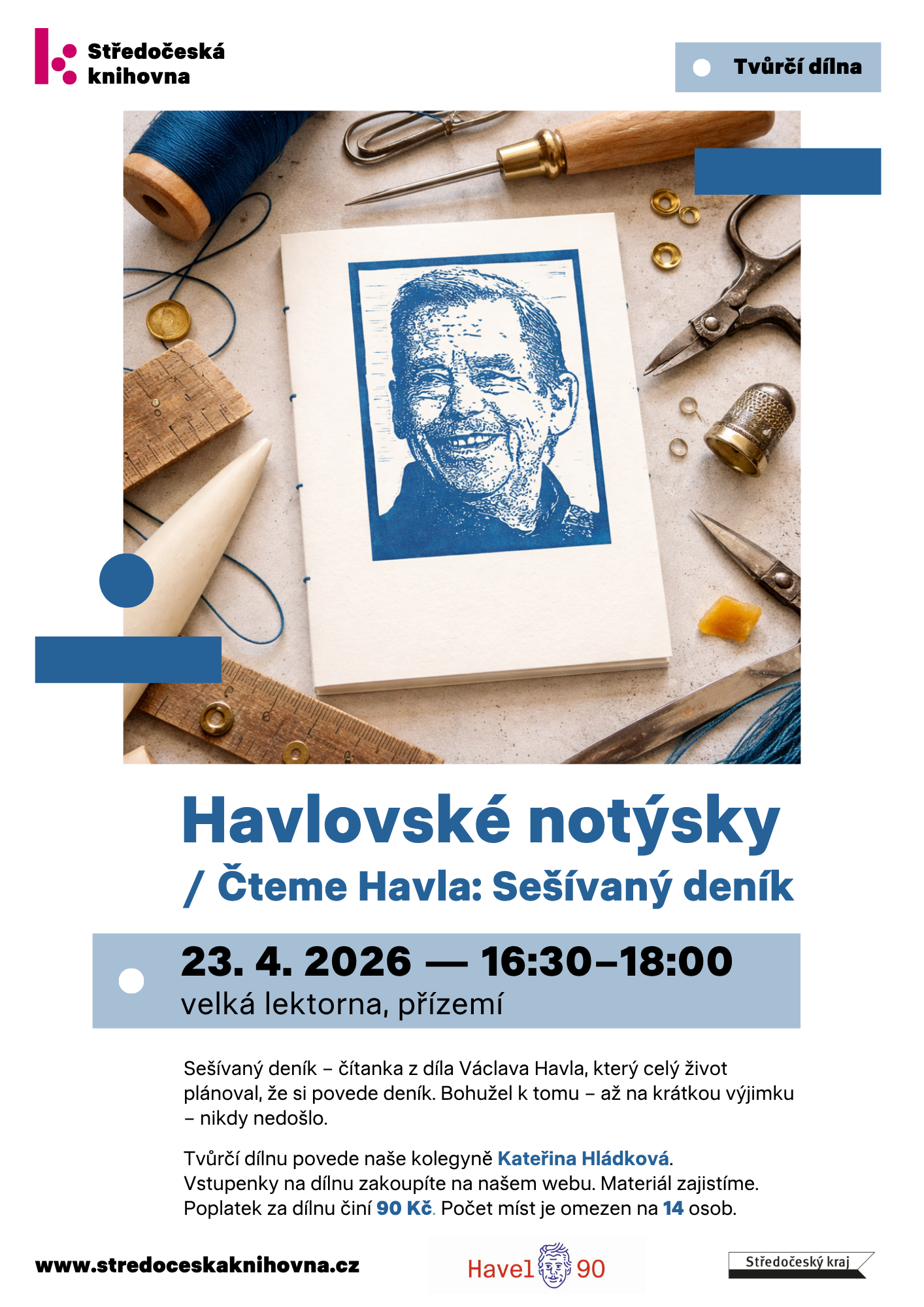 Jednoduchou knihařskou technikou si vyrobíte ručně šitý notýsek s motivem a citáty Václava Havla. Lekci povede naše kolegyně Kateřina Hládková. Ale to nebude vše. Samotnou výrobu budeme prokládat čtením ukázek z publikace Sešívaný deník, jejímž autorem je právě Václav Havel. Ukázky budou číst Štefánie Šubová a Vendula Humlová.
