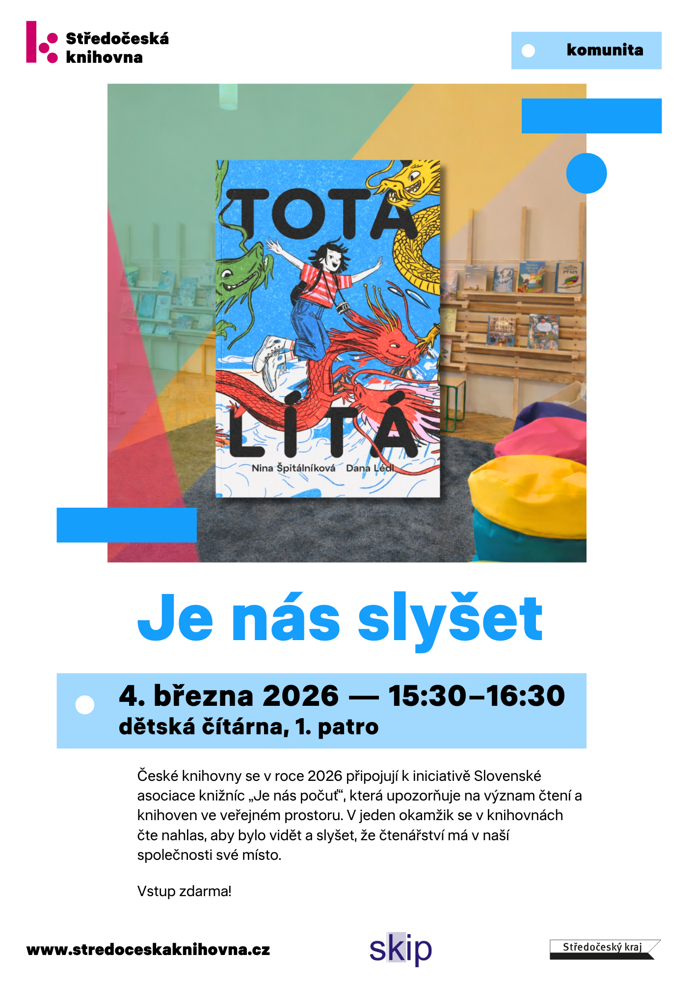 České knihovny se v roce 2026 připojují k iniciativě Slovenské asociace knižníc „Je nás počuť“, která upozorňuje na význam čtení a knihoven ve veřejném prostoru.