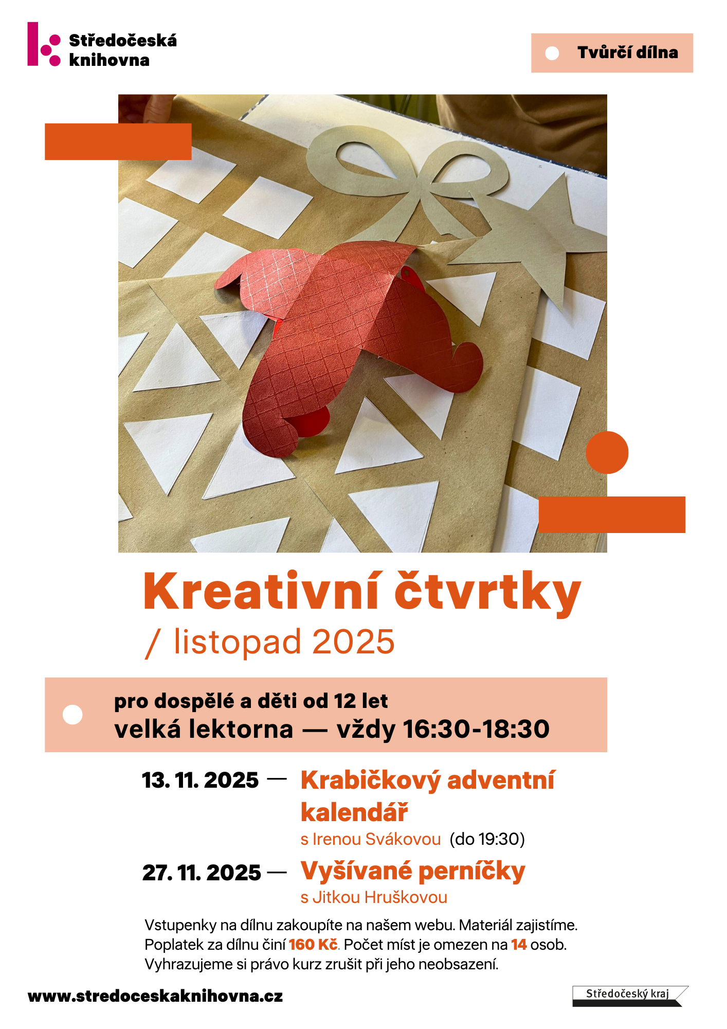 Na této dílně si společně s osvědčenou lektorkou Irenou Svákovou, známou z kurzů zaměřených na knižní vazbu, vytvoříme adventní kalendář s využitím knihařské lepenky a barevných kartonů.