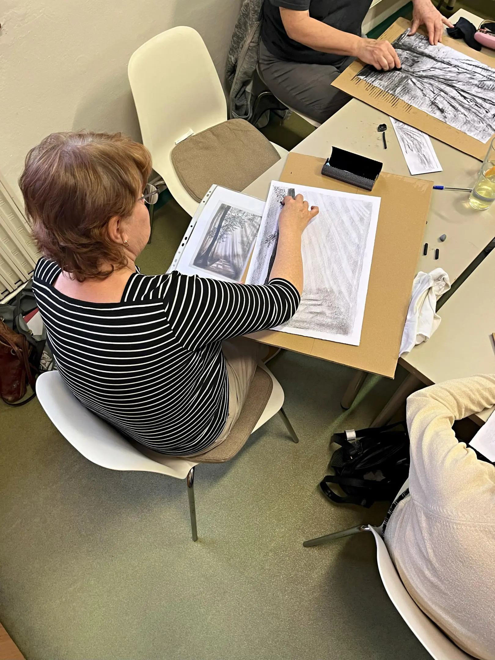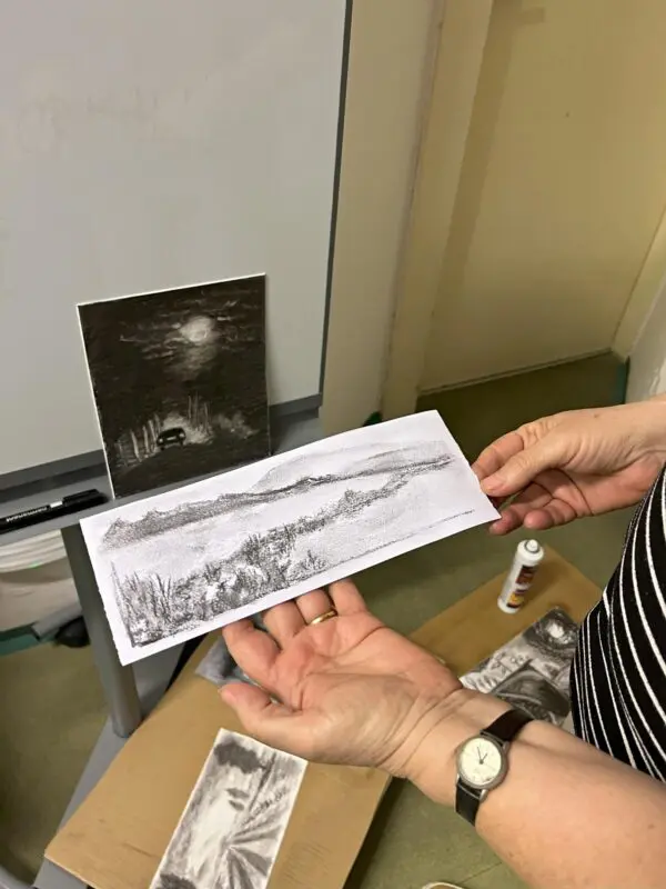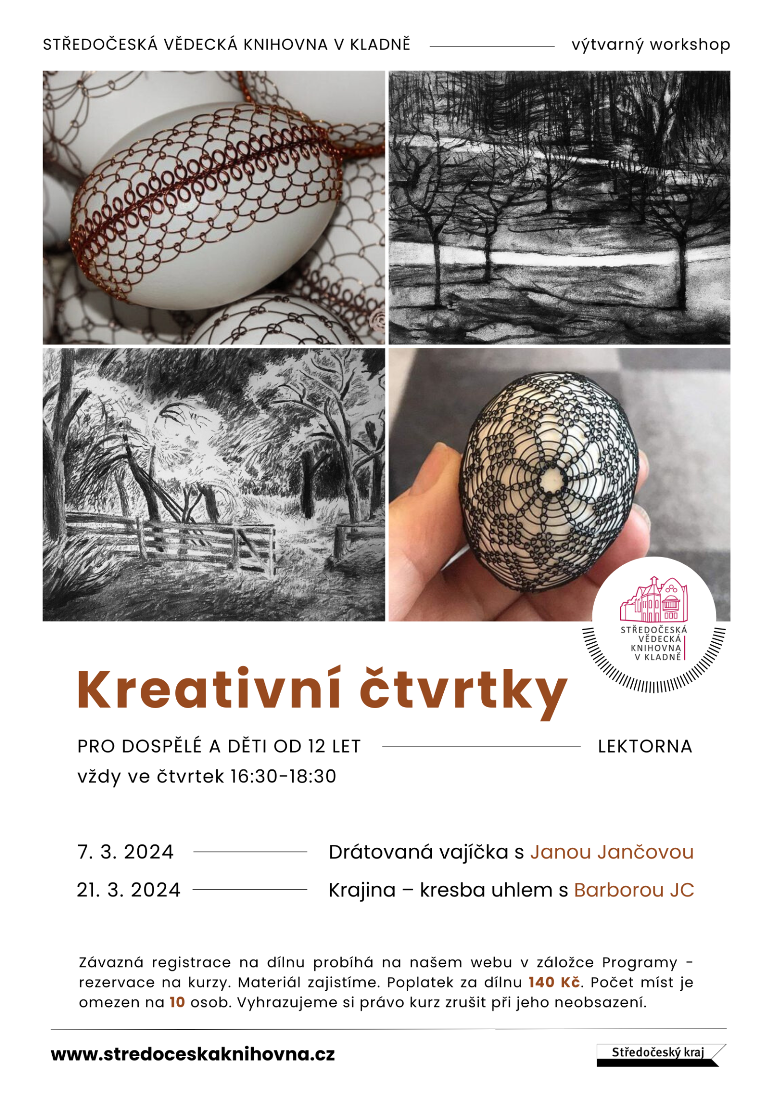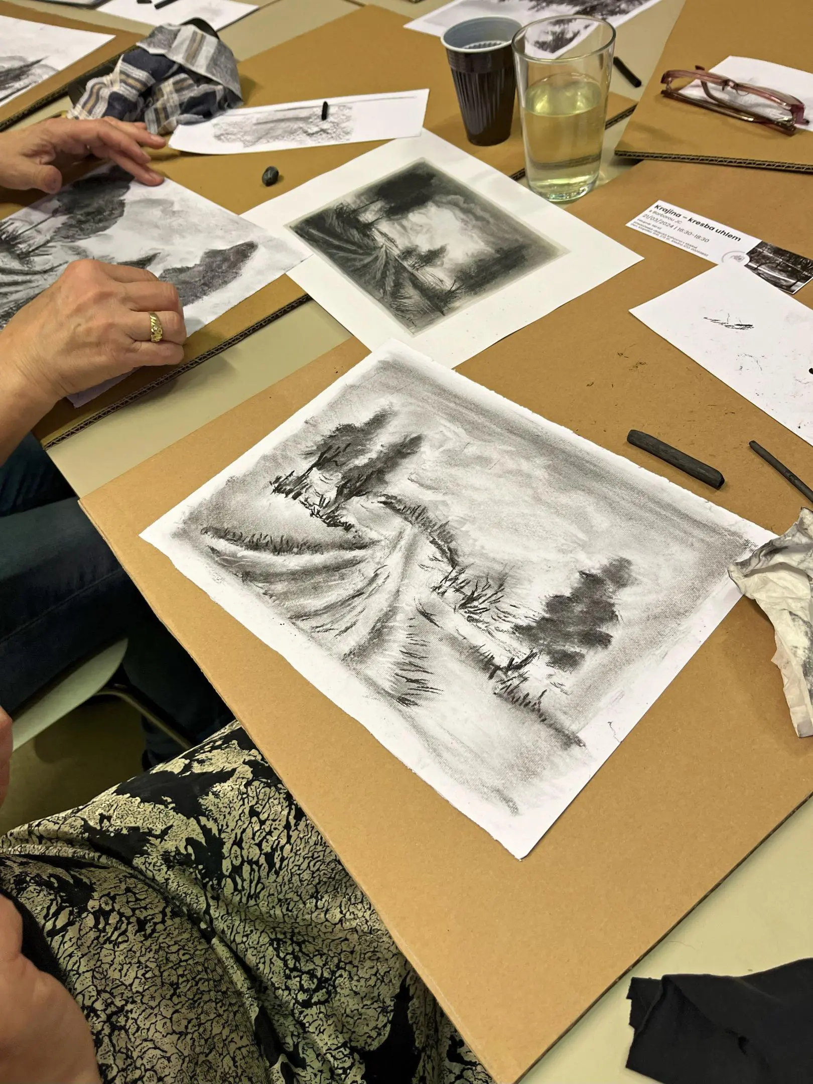 Barbora JC, vlastním jménem Barbora Cajthamlová Jelínková, které až do 14. 3. 2024 probíhá výstava s názvem Kresby ve výstavní síni v přízemí naší knihovny, nás naučí, jak pracovat s uhlem. Zkusíme si namalovat krajinku. Pokud nevíte, jaký motiv krajiny zvolit, bude lepší si pro tento účel přinést nějakou černobílou fotografii krajiny, kterou byste rádi nakreslili.