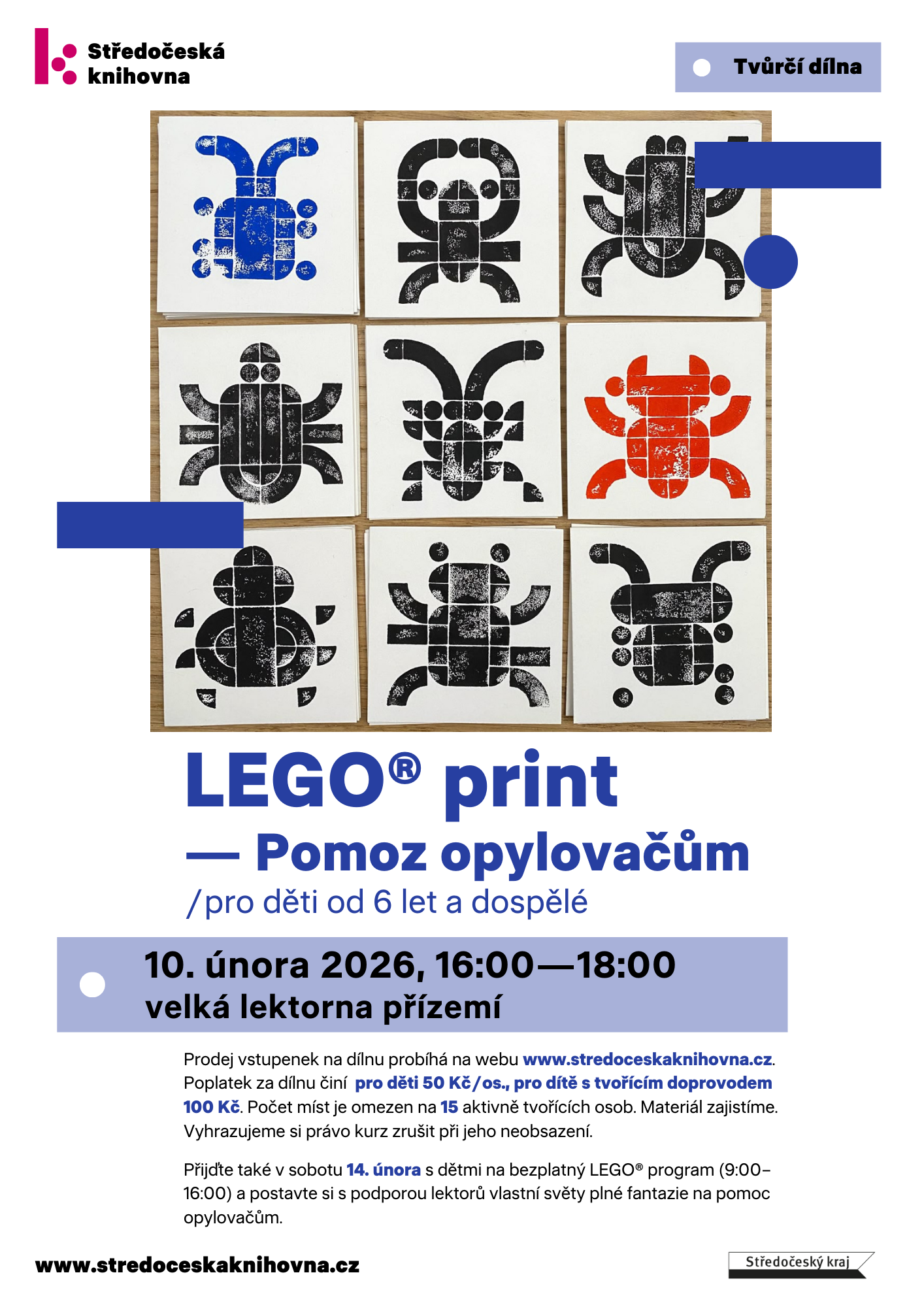 Nás ano. Takže jsme se rozhodli pro vás a vaše děti uspořádat workshop, kde se pokusíme si tuto techniku osvojit. Kostičky z Lega zde slouží jako materiál k otisku výsledného vyskládaného obrázku na papír pomocí tiskařské barvy (ředitelná vodou). Účastníci si tedy na závěr odnesou malou originální grafiku, či dokonce několik. Záleží, jak budou pilní. Kostičky si bohužel odnést nemůžete, budou nám sloužit ještě na dalších kurzech.