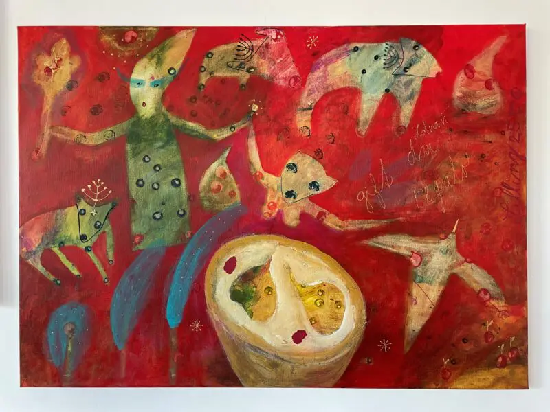 „Malování je pro mě způsob, jak se propojit sama se sebou i s lidmi, kteří se na má díla dívají. Vyrůstala jsem obklopená hedvábím – můj dědeček mi přivážel šátky z Číny – a právě to mě přivedlo k technice malby na hedvábí. Fascinuje mě, jak se barva na tomto materiálu rozpíjí, jak se nedá úplně zkrotit. Naučilo mě to respektovat tok a rytmus, který si látka sama určí, a zároveň hledat způsoby, jak mu dát jasný tvar. Postupem času jsem začala tvořit i akrylem na plátno, ale zkušenost s hedvábím ve mně zůstala. I na plátně hledám jemné barevné přechody, organické tvary a klid, který se může potkat s energií. Mnoho mých obrazů je inspirovaných přírodou a východní estetikou – nepopisuji konkrétní motivy, spíš zachycuji atmosféru, pocit, vnitřní krajinu.
