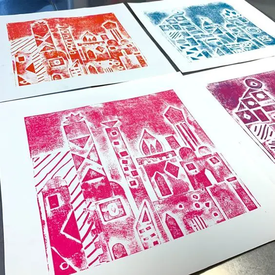 Vytvoříme si motiv z různě strukturovaných papírů, kartonů a lepenek a pak jej – stejně, jako to děláme s linorytem – otiskneme na čistý list papíru. Výhodou u této techniky je, že části obrázku, které se vám nebudou pozdávat, není problém odstranit a nahradit. Což by nám linoryt nedovolil.