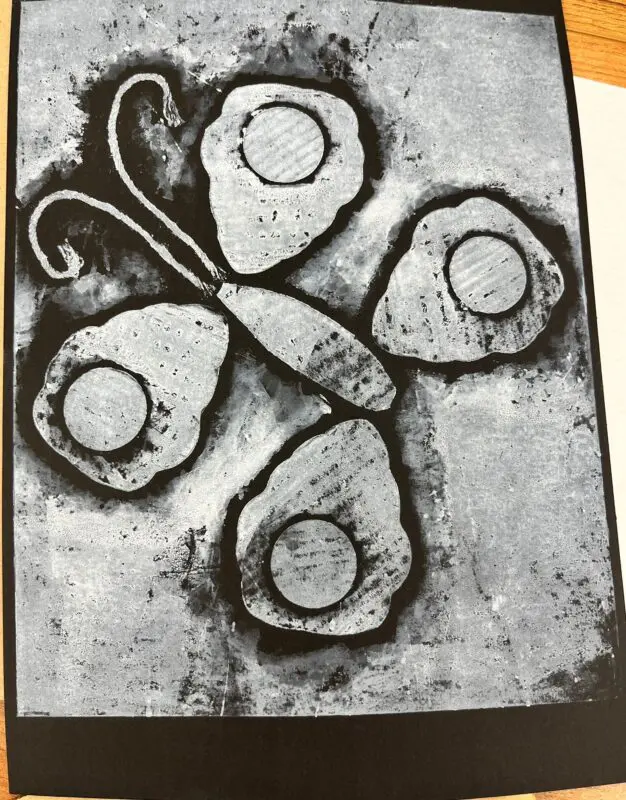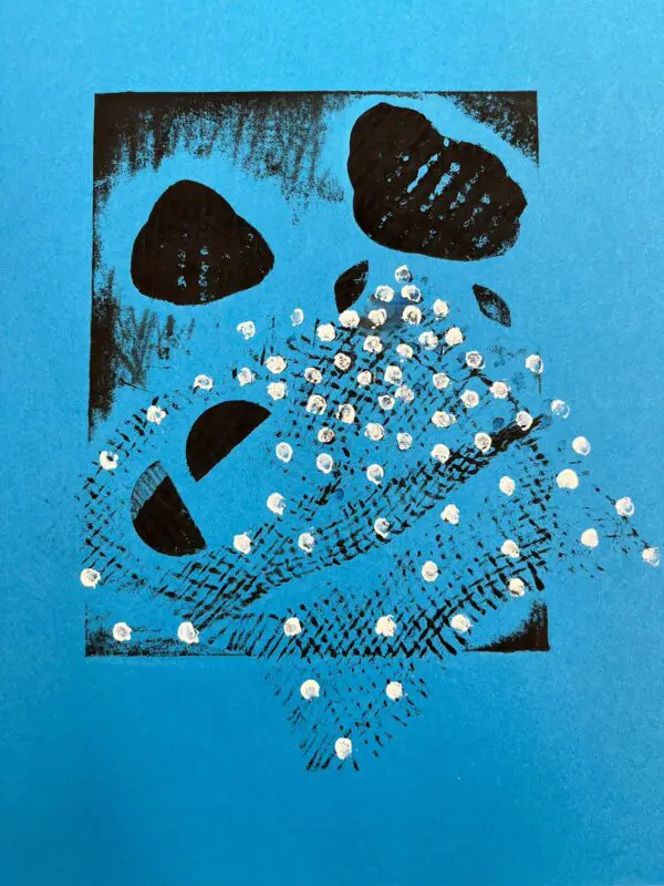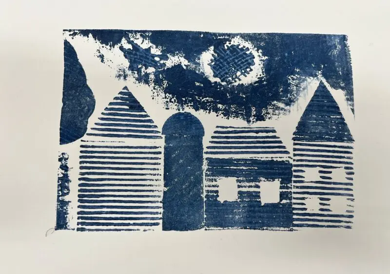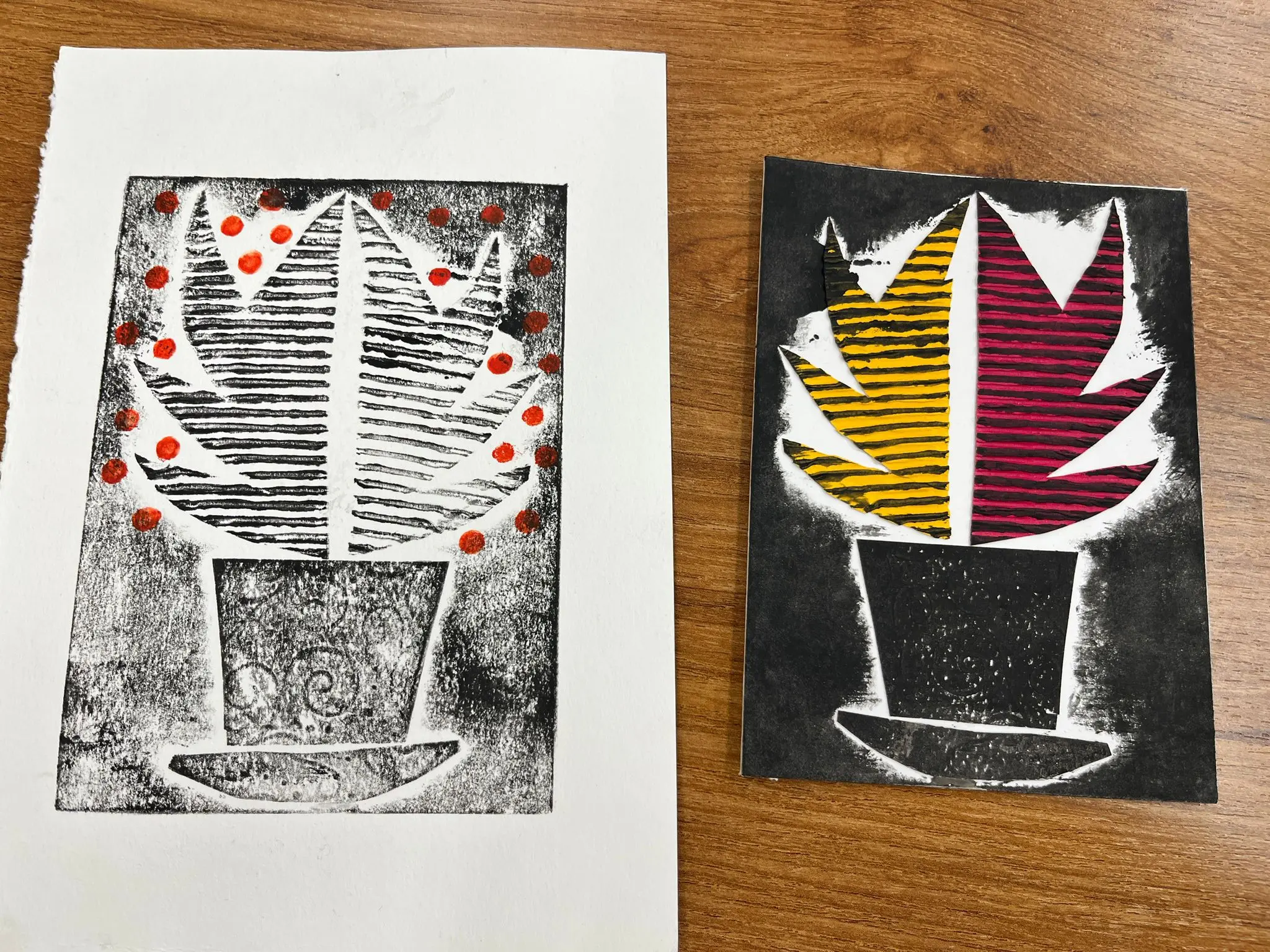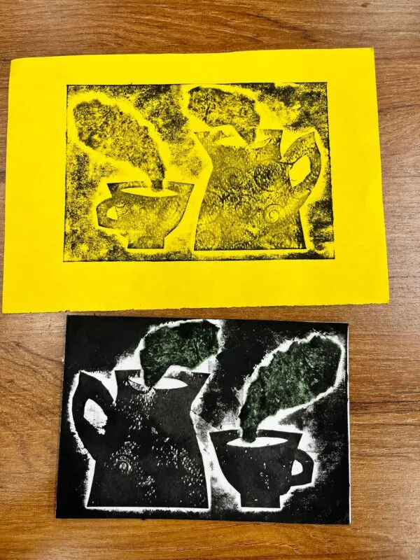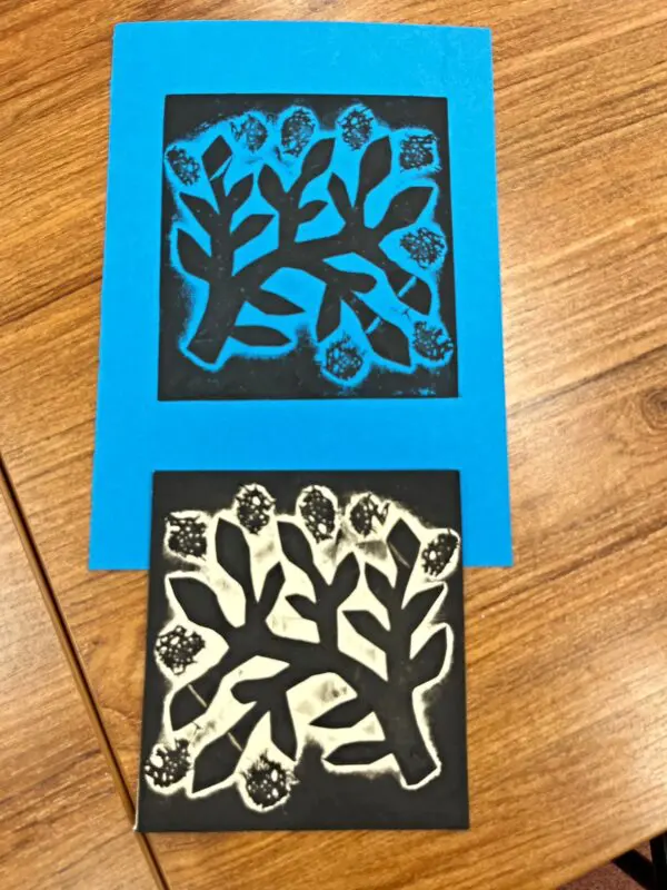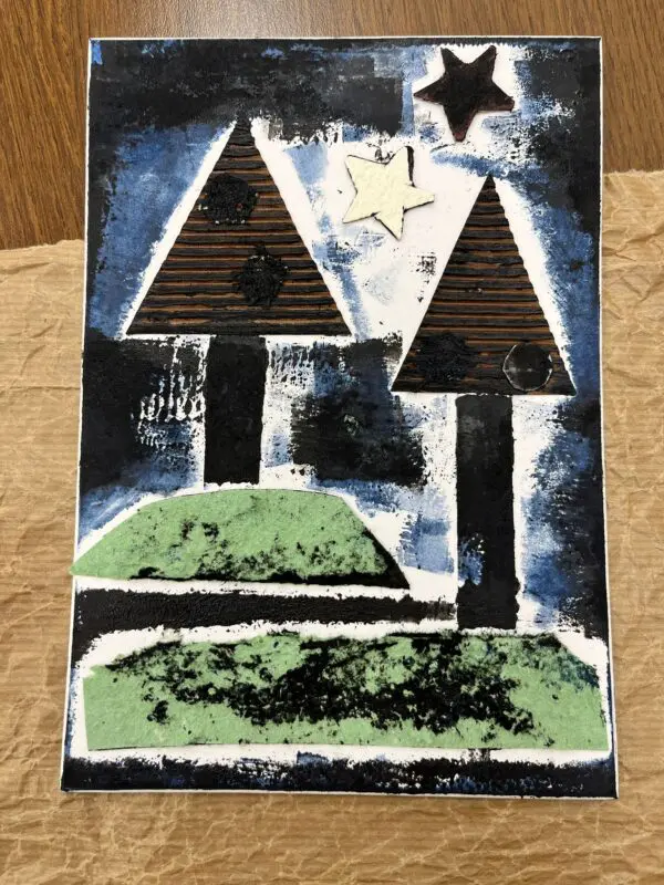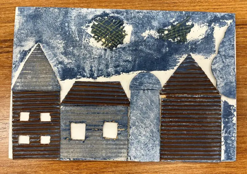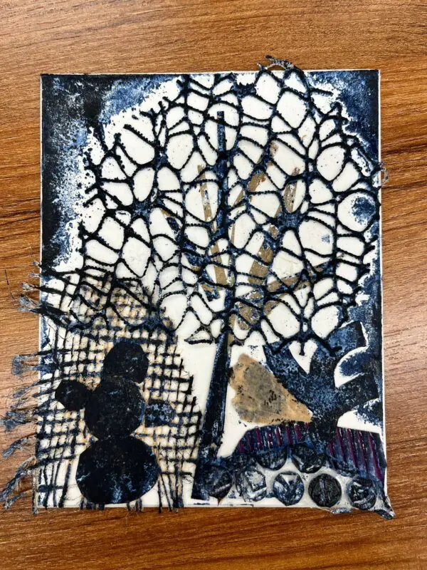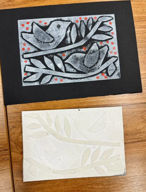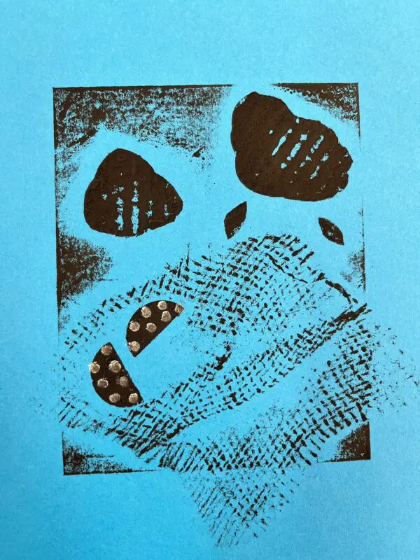 Vytvoříme si motiv z různě strukturovaných papírů, kartonů a lepenek a pak jej – stejně, jako to děláme s linorytem – otiskneme na čistý list papíru. Výhodou u této techniky je, že části obrázku, které se vám nebudou pozdávat, není problém odstranit a nahradit. Což by nám linoryt nedovolil.