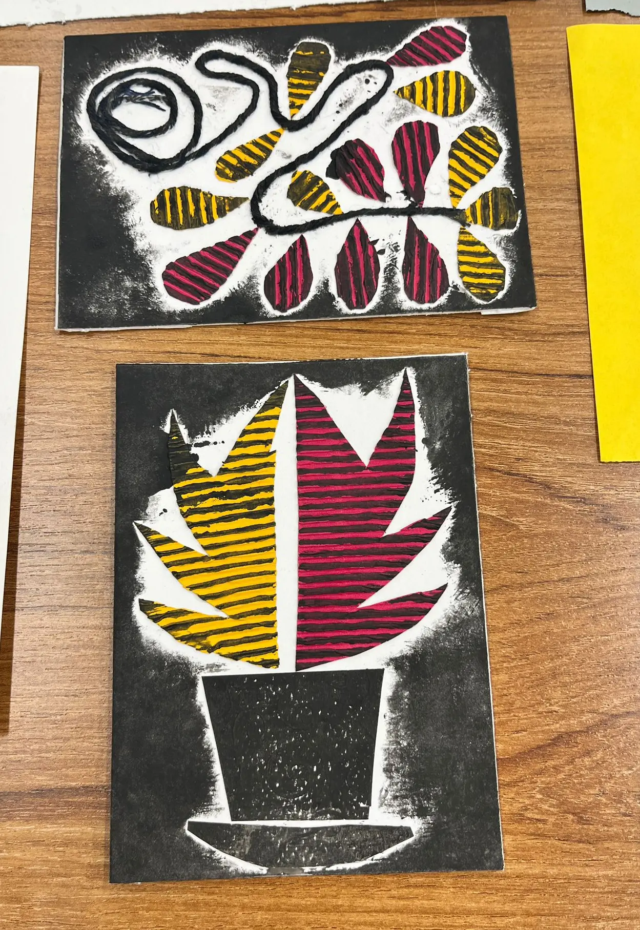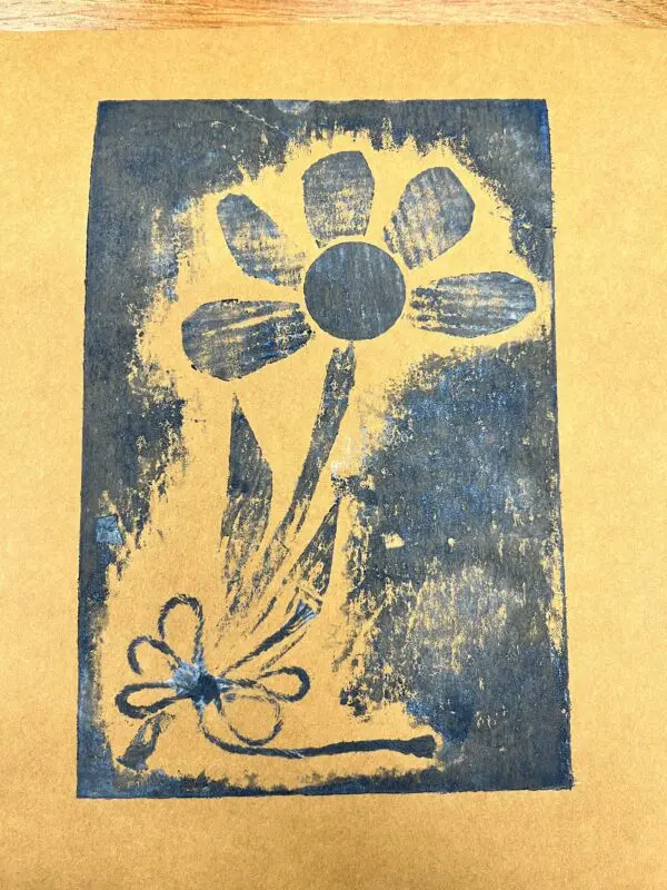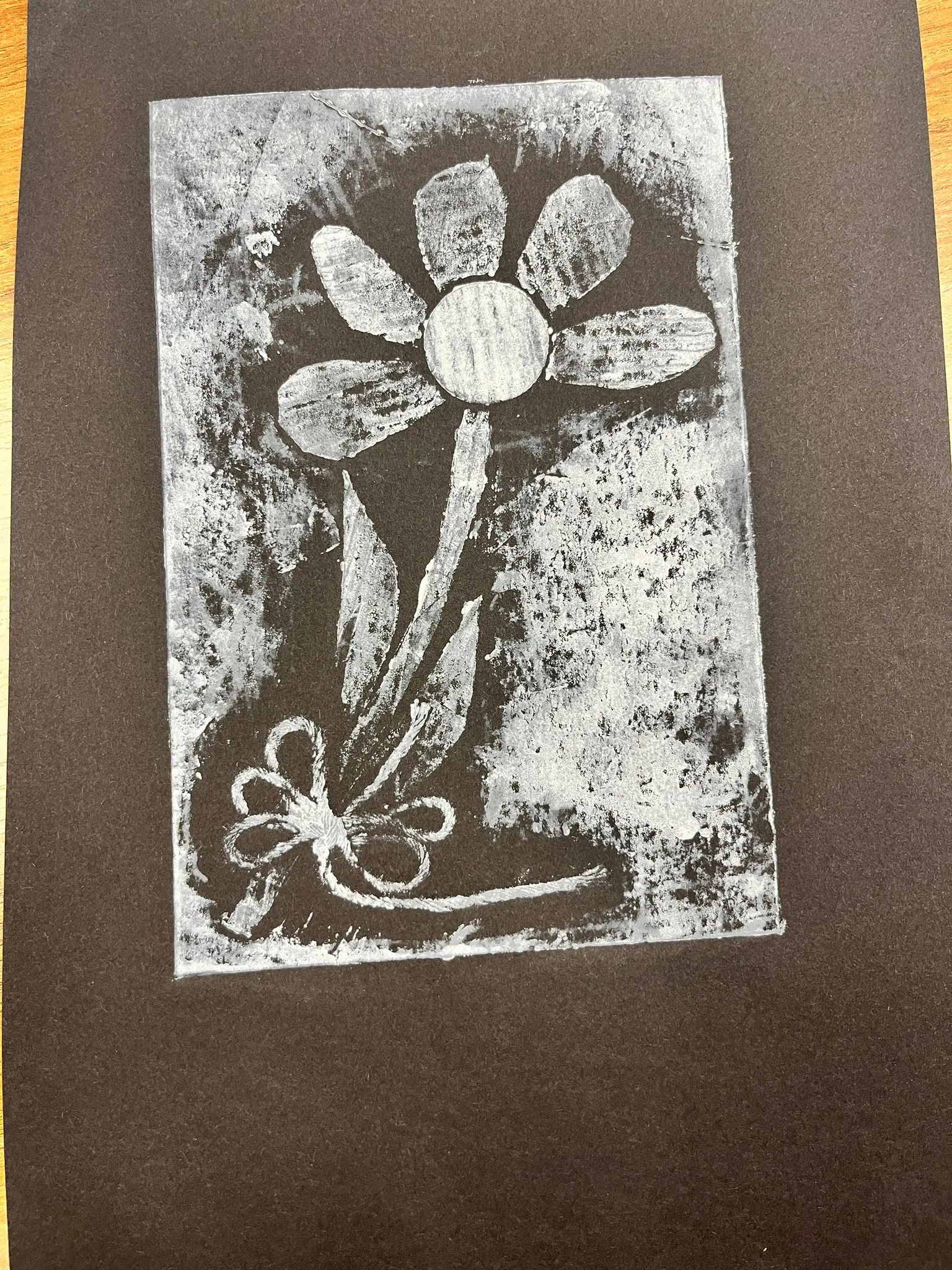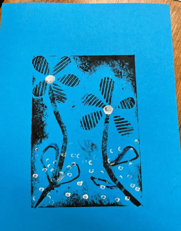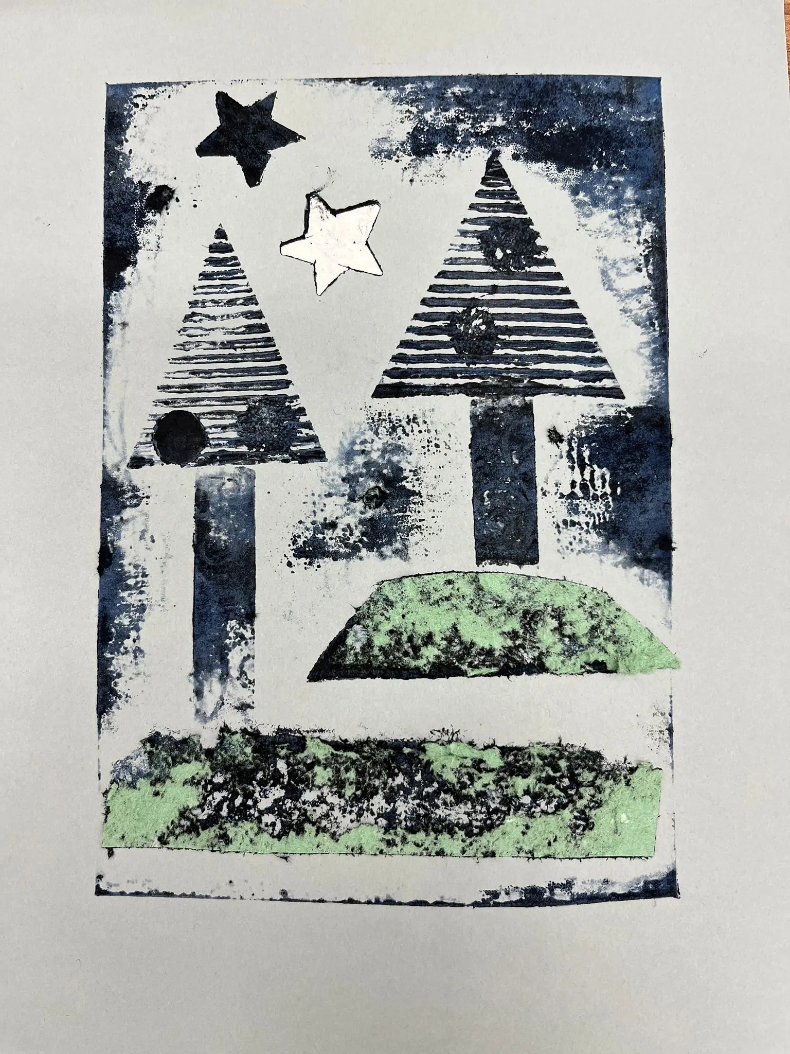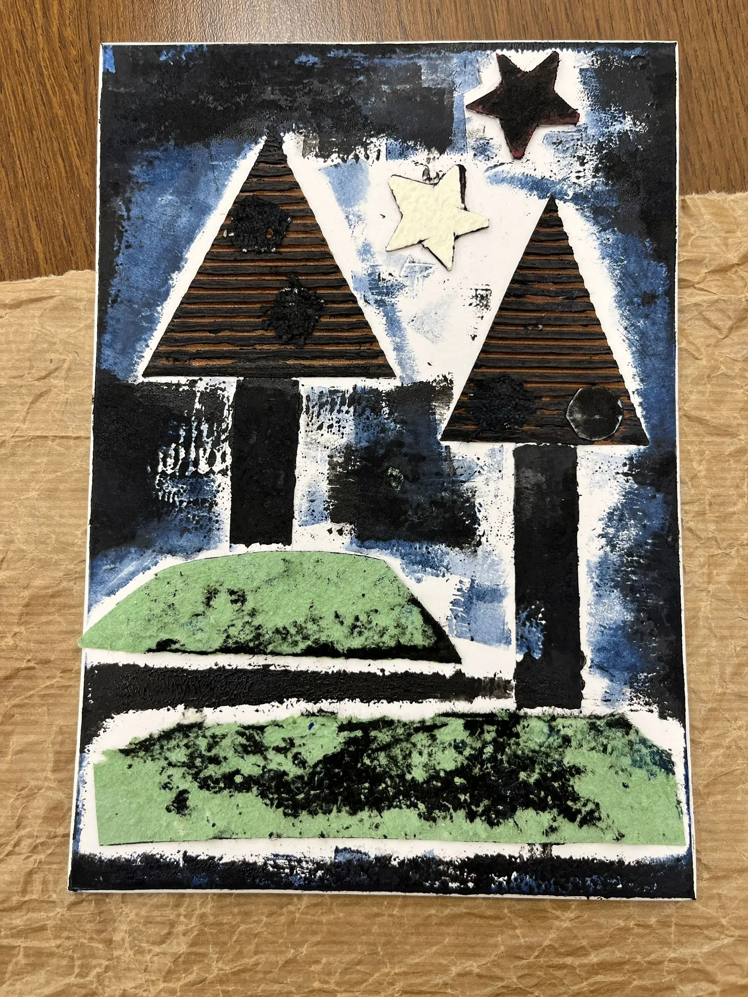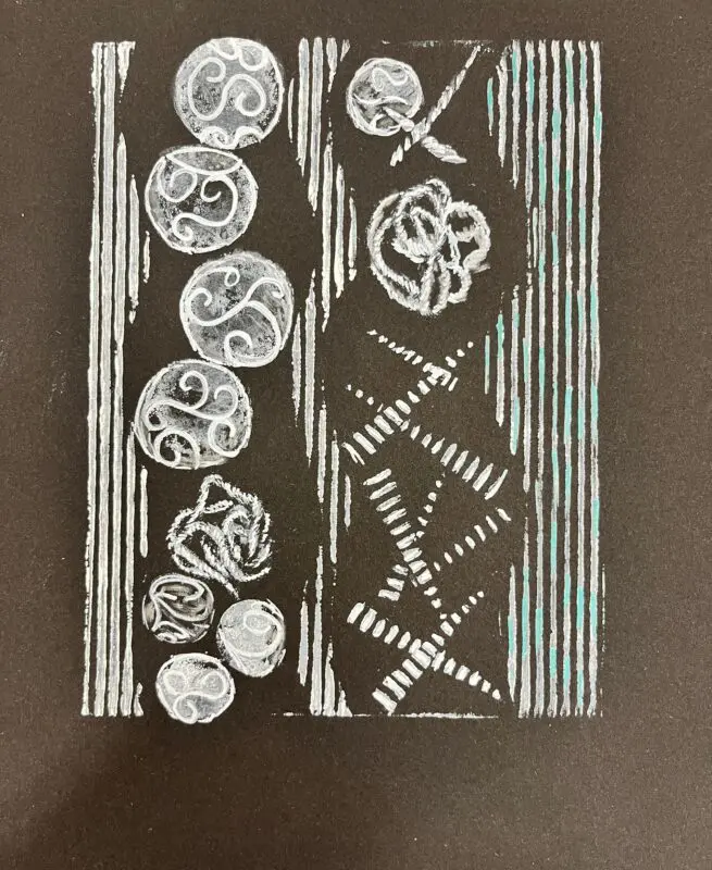 Vytvoříme si motiv z různě strukturovaných papírů, kartonů a lepenek a pak jej – stejně, jako to děláme s linorytem – otiskneme na čistý list papíru. Výhodou u této techniky je, že části obrázku, které se vám nebudou pozdávat, není problém odstranit a nahradit. Což by nám linoryt nedovolil.