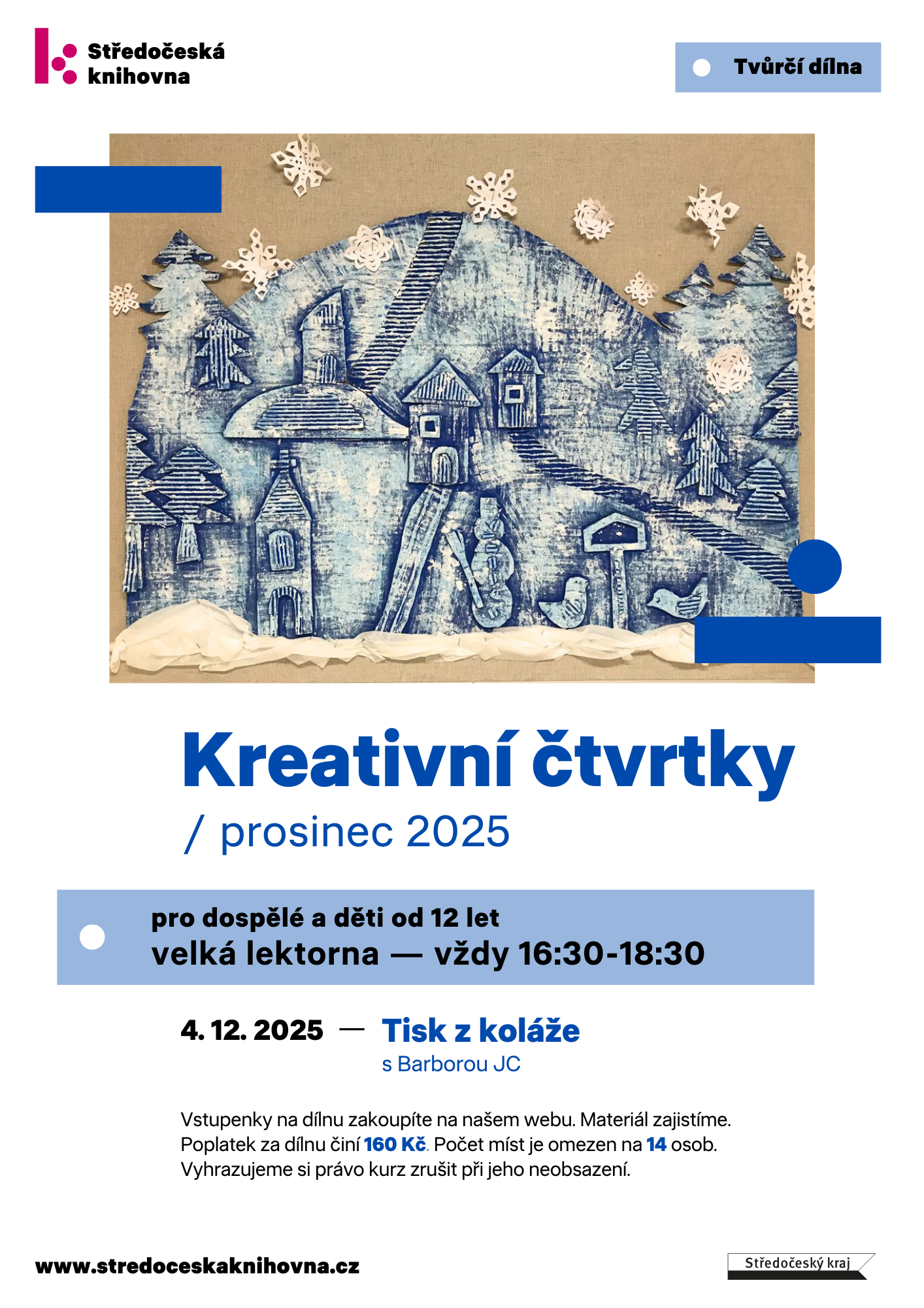 Poslední letošní dílna bude opět vánočně laděná. S malířkou a lektorkou Barborou JC si vyzkoušíme techniku, kterou jsme doposud v knihovně netvořili. Ale často ji vídáme u našich dětí, které ji běžně využívají ve výtvarné výchově ve školách. Jde o tisk z papírové koláže.
