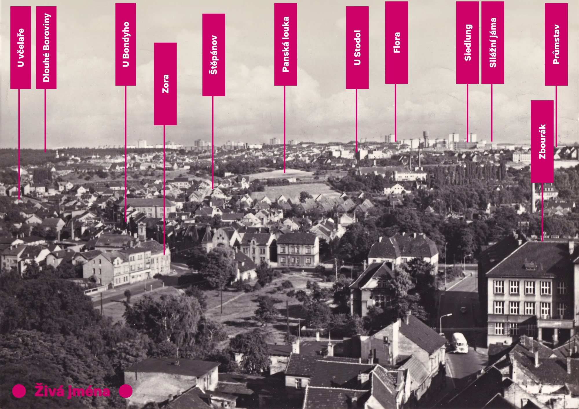 Sbíráme všechna označení míst ve městě, která žijí mezi lidmi. Zkráceniny oficiálních názvů ulic, náměstí nebo sídel institucí. Názvy vzniklé lidovou tvořivostí. Stará označení, která se stále drží v paměti. Jména, která jste kdysi vymysleli se spolužáky a stále je používáte…